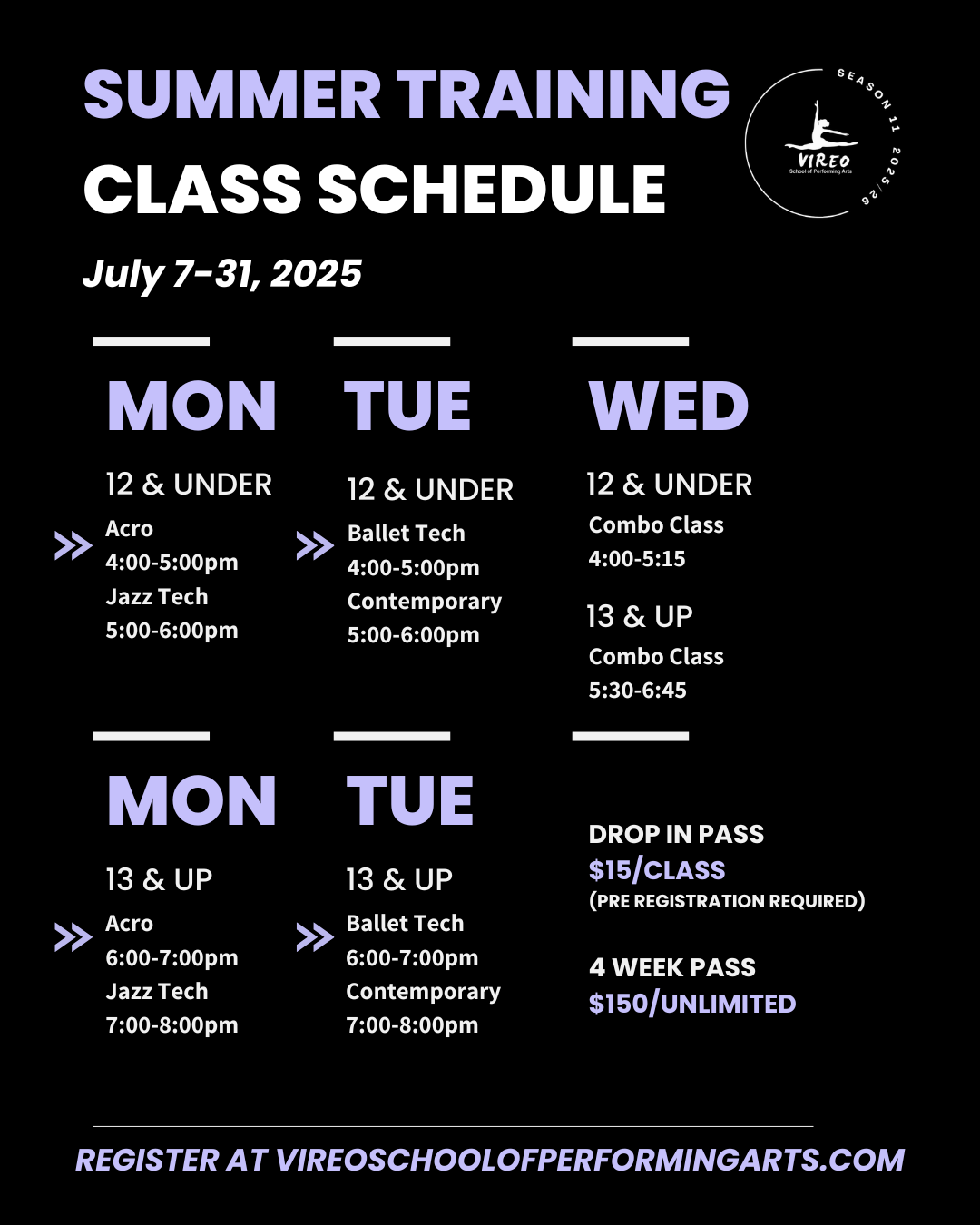 Set yourself up for success for the 2025/26 season by continuing your training consistently throughout the summer! Classes offered in Ballet, Jazz, Contemporary, Acro/Conditioning/Stretch, and a weekly combo class in a rotating style. Maintain and continue to improve your technique in conditioning and technique classes, and grow your artistry, movement quality, speed of pick-up, and performance quality in combo classes. Join us for classes this July!